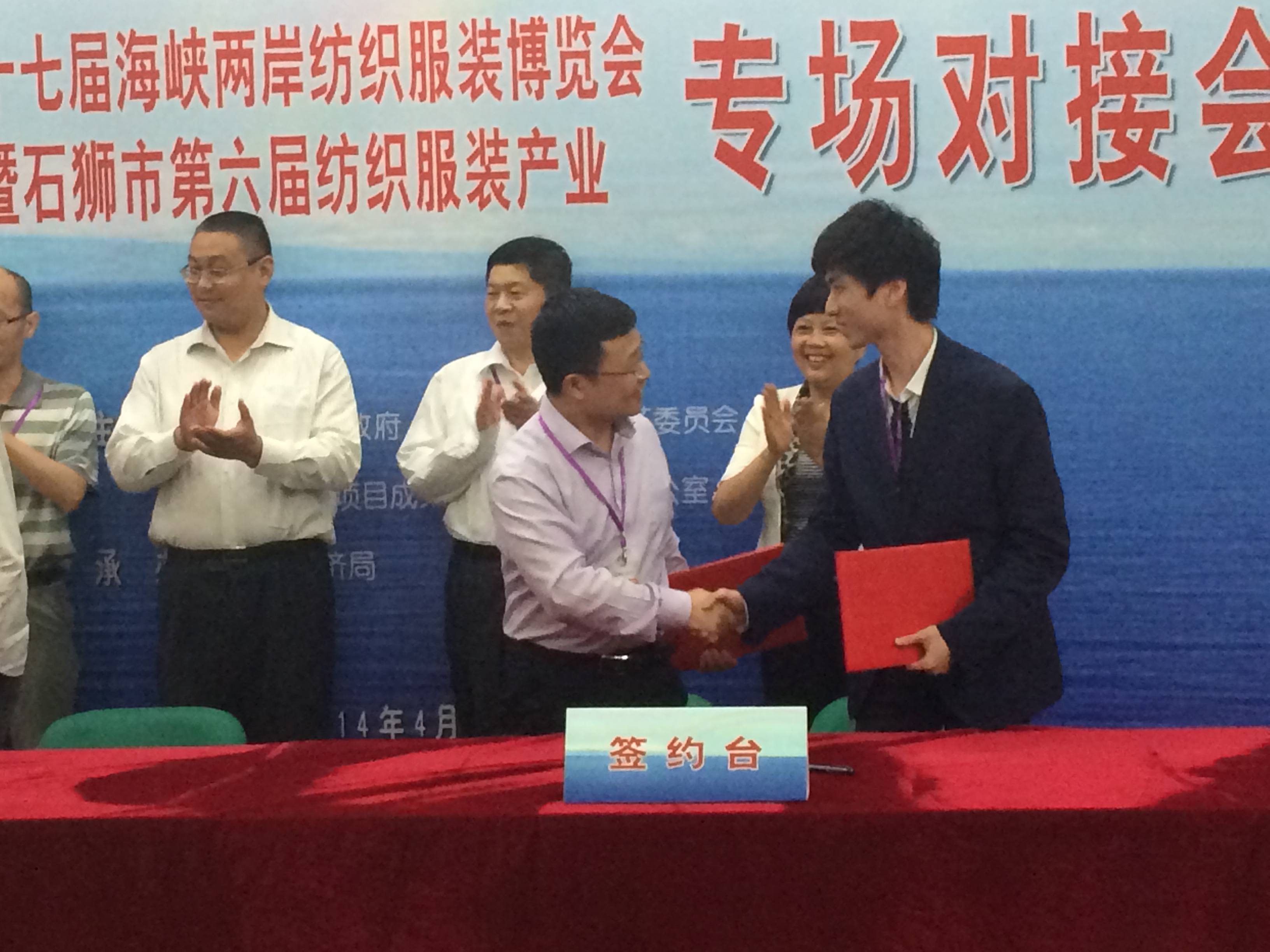 4月18日,第17届海峡两岸纺织服装博览会暨6·18第六届纺织服装产业专场对接会在海博会主展馆举行,该对接会由石狮市人民政府与泉州市发展和改革委员会、中国·海峡项目成果交易会组委会办公室共同举办,副市长庄宝玲出席了会议。我校我院院长夏东升教授代表武汉纺织大学我院与福建汉祥纺织科技有限公司就夏东升研究团队研发的纺织印染大规模废水资源化技术达成合作协议,计划总投资1200万元。该项目的签订标志着我校产学研发展步入一个新的阶段。