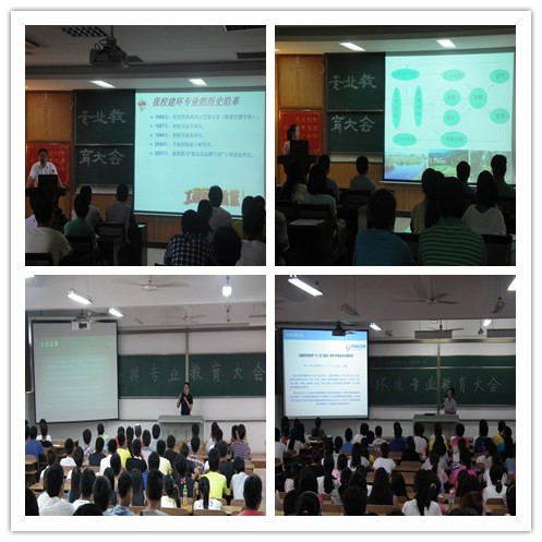 在环境工程专业教育大会上,夏东升院长在进行专业教育的同时介绍了环境专业的发展前沿。生物教研室蔡亚君老师通过当代社会发展,向生物工程专业的新生介绍了生物专业的学习内容和就业方向。在给排水工程和建筑环境工程专业教育大会上,龙学军老师和郑万兵老师结合自己多年从事工程项目的经验,结合当代社会发展和就业情况以及“95新生代”的特点,通过图表、PPT展示的方式,从专业的历史变革、学校师资、考研情况、就业领域、专业前景这五大方面介绍了给排水和建环专业。