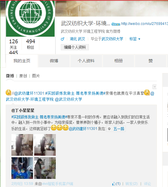 建环班的陈钱标同学则在微博上晒出自己参加孝亲活动的照片:“孝亲不是一时的作秀,而是应当融入到日常生活中,帮母亲择菜,给弟弟剥一个桔子,一家人都快乐!”