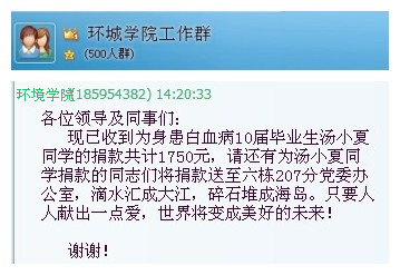 疾病无情人有情,曾就读我院的2006级学生汤晓夏,现就读于江苏大学我院学院研究生三年级,被确诊为白血病的消息传来后,我院党政领导高度重视,在学院内组织了捐款活动,共募捐救助金8000元。