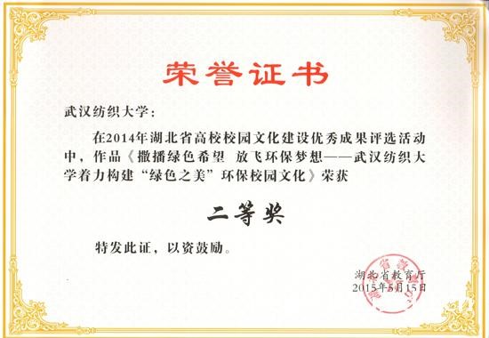 2.《撒播绿色希望放飞环保梦想--武汉纺织大学着力构建“绿色之美”环保校园文化》获湖北省高校校园文化建设优秀成果二等奖。