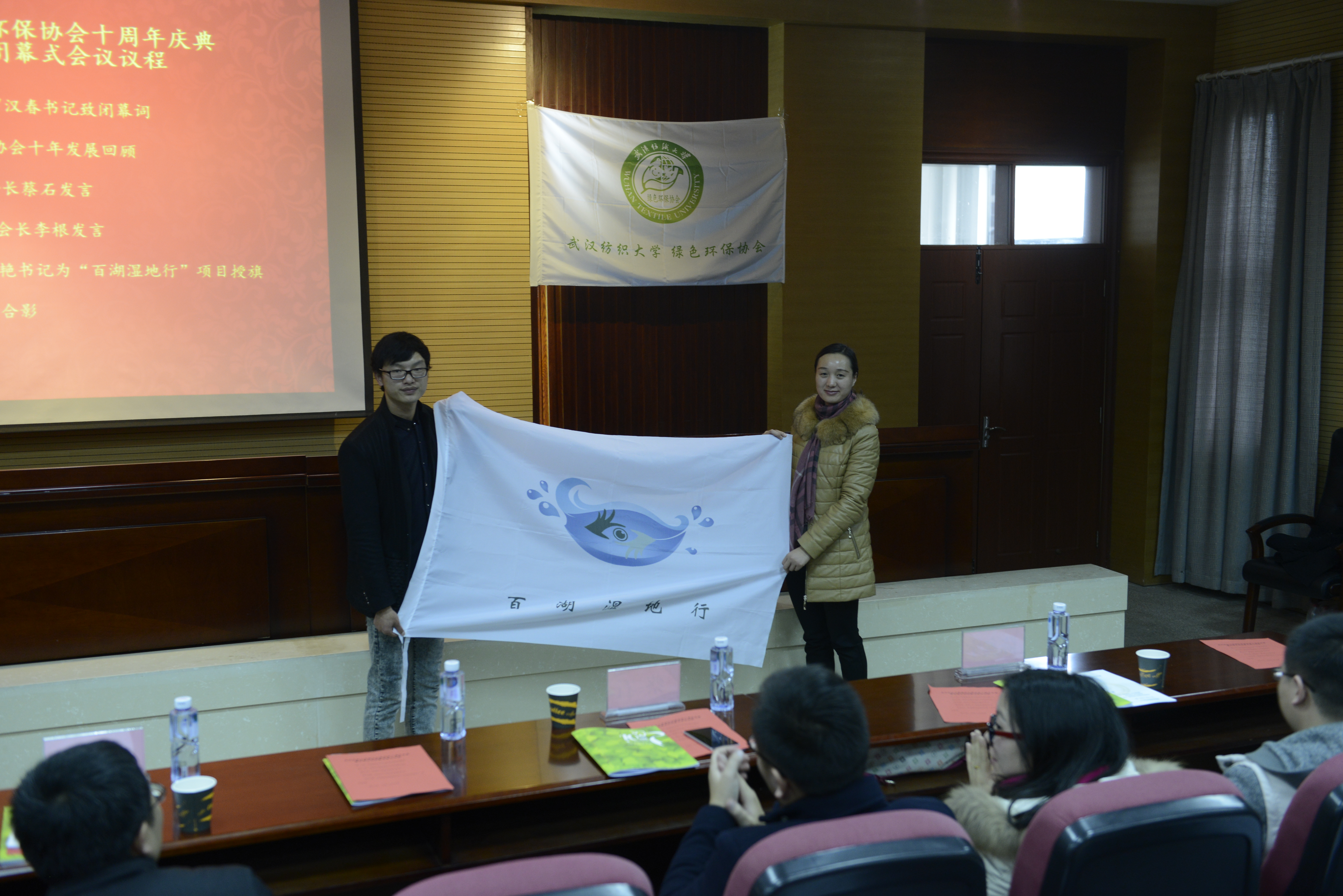 在一同观看了绿协十周年纪念视频后, 罗汉春书记在闭幕式上对绿协过去十年取得的成绩予以肯定并对绿协未来的发展提出了新的要求,绿协第七届会长,现就职于武汉建工安装公司的蔡石同学和协现任会长的分别分享了他们与绿协的成长故事。闭幕式最后,校团委书记金艳教授为中华环境保护基金会“百湖湿地行”项目进行授旗。