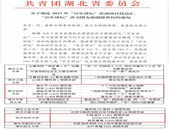 按照“党建带团建”,“典型引路”的方式来攀登“理想信念的上线”,绿协团支部“四信四进我能行,祖国变化我来谈”获评湖北省“百生讲坛优品汇”项目、湖北省创青春课外科技竞赛二等奖1项、学院团委获校“十佳基层团组织”、两支社会实践团队分获学校重点资助和一般资助,水污染治理团队项目获团中央社会实践专项立项。
