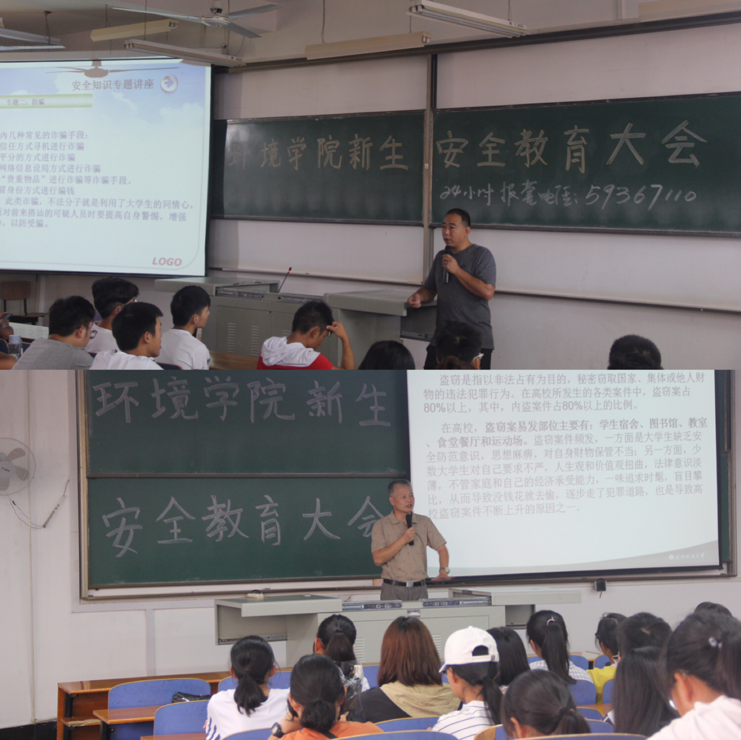 校保卫处尚天飞老师和夏向阳老师同时提出法制观念的重要性,提醒18级新生提高安全防范意识。尚老师着重强调防盗和防骗,提醒学生盗窃主要事发地点,要加强警惕,在完成学业的同时不能忽视自己的安全。