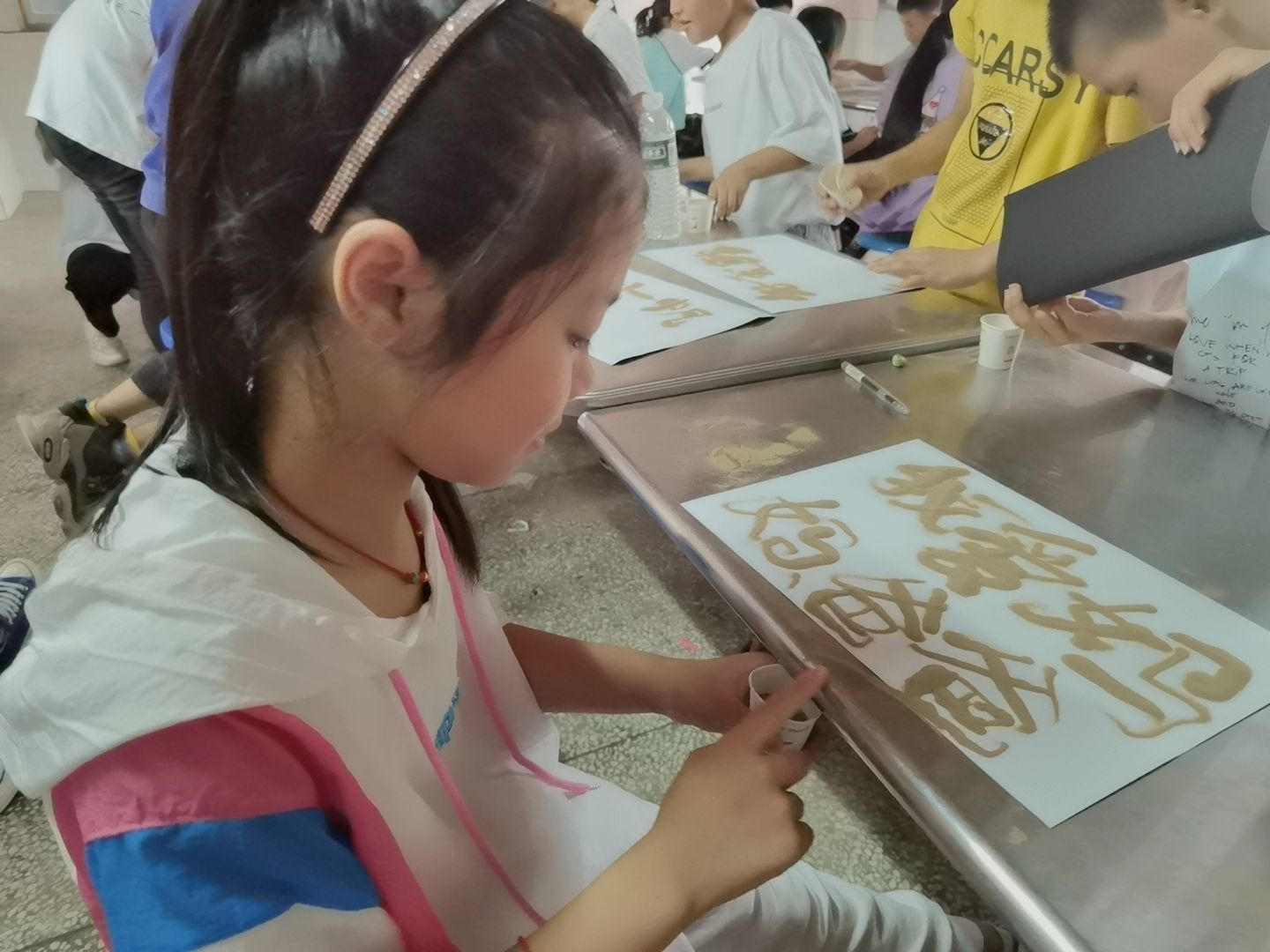 窗外大雨如注,窗内氛围暖暖,我们和孩子们一起进行了沙画、刮画的创作。有个叫张倩的孩子突发奇想,沙子写下“小帆哥哥最帅”,拉着我去欣赏,我很感动,向他竖起了大拇指。还有个孩子,爸妈长期在外打工,由爷爷奶奶照顾他的日常写下了“我爱妈妈爸爸”,心头一颤。