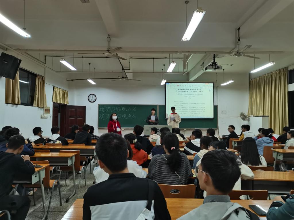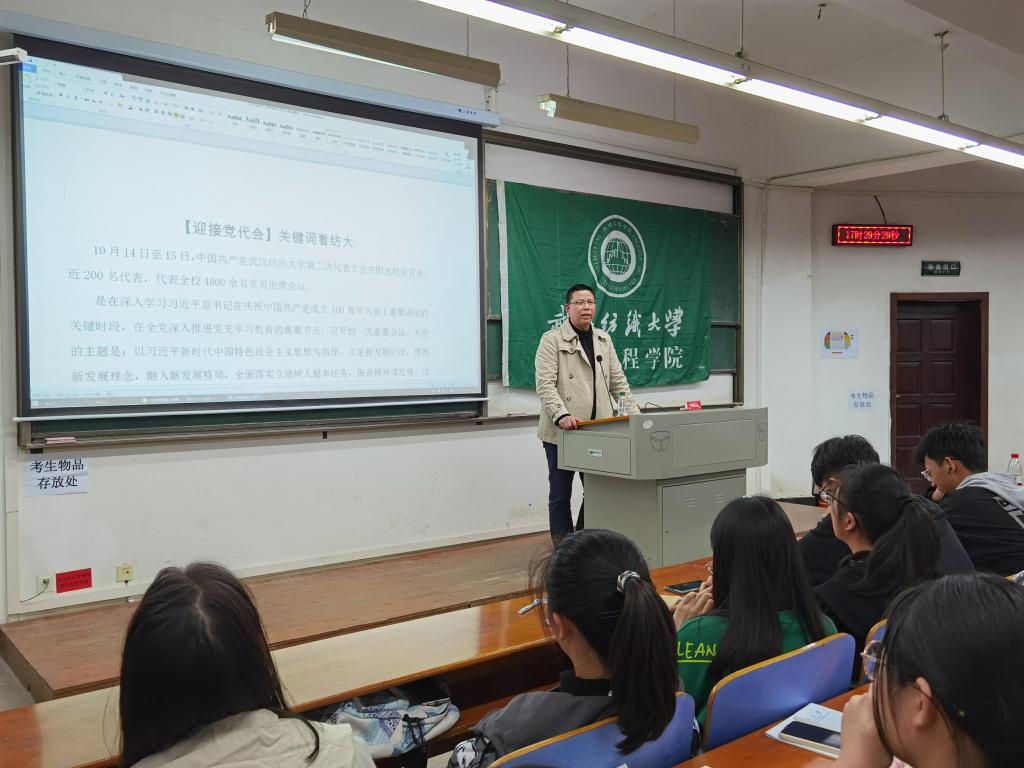 10月17日下午,副书记刘园美在3-T102教室与全体2021级同学一起回顾了“关键词看纺大”系列内容,他对ESI学科、省优势特色学科群、湖北“国内一流学科”建设高校、国家一流专业等72个党建思政、人才培养、科学研究、社会服务、文化传承与创新、国际交流合作等方面的内容一一解读,向同学们介绍了七年多来学校的发展成就,增强大家对专业的自信和爱校荣校自豪感。