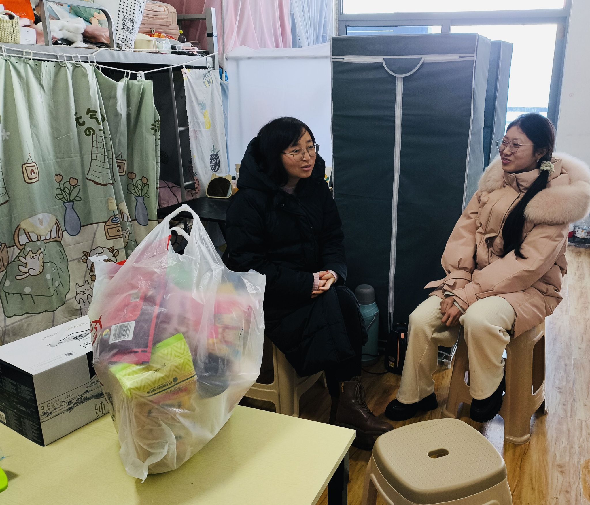 在叶同学住处,老师们了解学生实习情况和家庭困难。叶同学家庭经济困难,本学期申请了国家助学金。临近春节,家人又生病住院,所以实习结束后着急回家,但购买了多趟列车,却还是在车站等了三四个小时未能成行,只能回到住处再候补买票。姚瑶询问了学生家长病情,肯定了学生的孝顺,同时也鼓励学生总结实习经验,抓住春招机会,找到心仪的工作。并转达了学院党委对学生的关爱,送上慰问物资。学生对两位老师的到来很是感动,感受到了来自学校和学院的关心,纷纷表示会坚定信心,积极求职,将在学校所学的专业知识应用于工作实践,为社会发展贡献自己的力量。