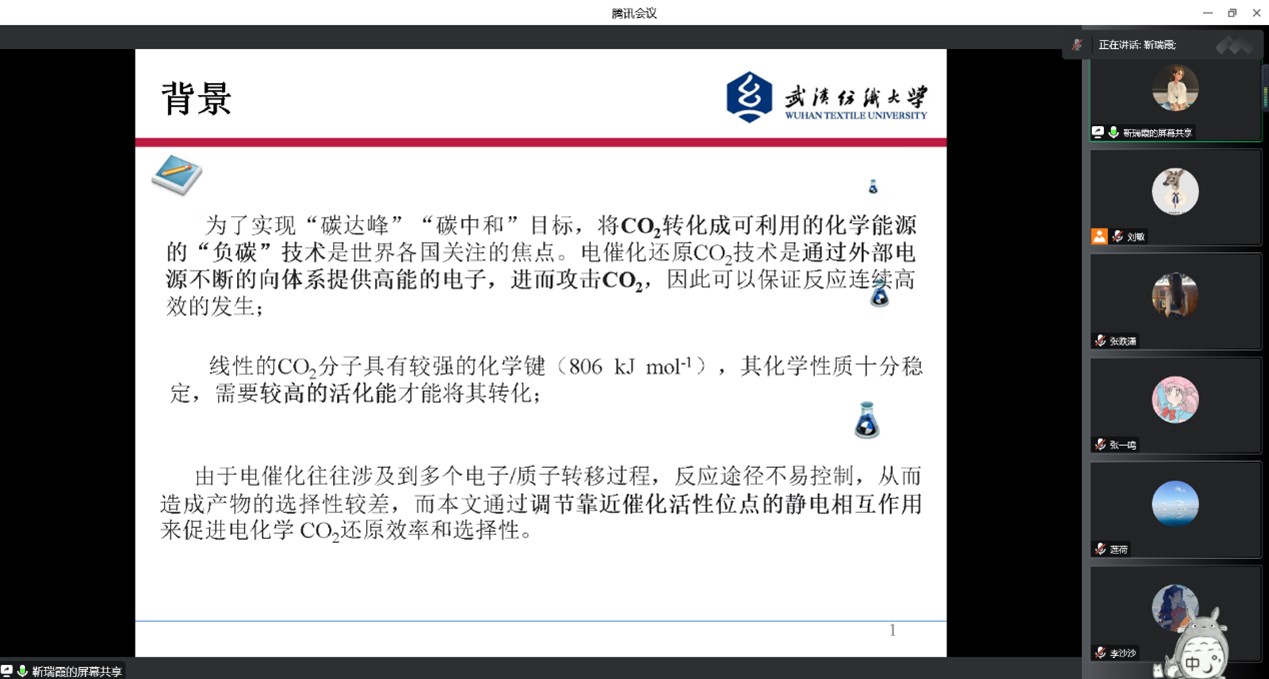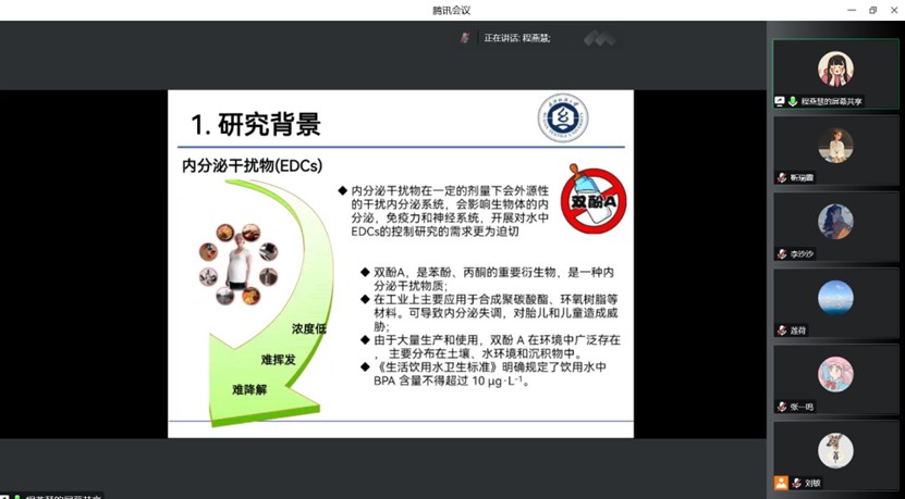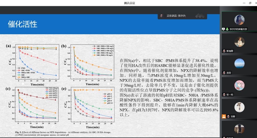 李沙沙同学介绍了通过简单的浸渍法使用腐植酸(HA)改性污泥生物炭(SBC),活化过氧单硫酸盐(PMS)降解萘普生(NPX)的实验研究,发现通过HA改性成功提升了污泥生物炭活化PMS的能力。