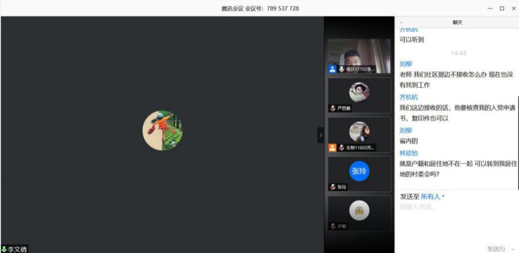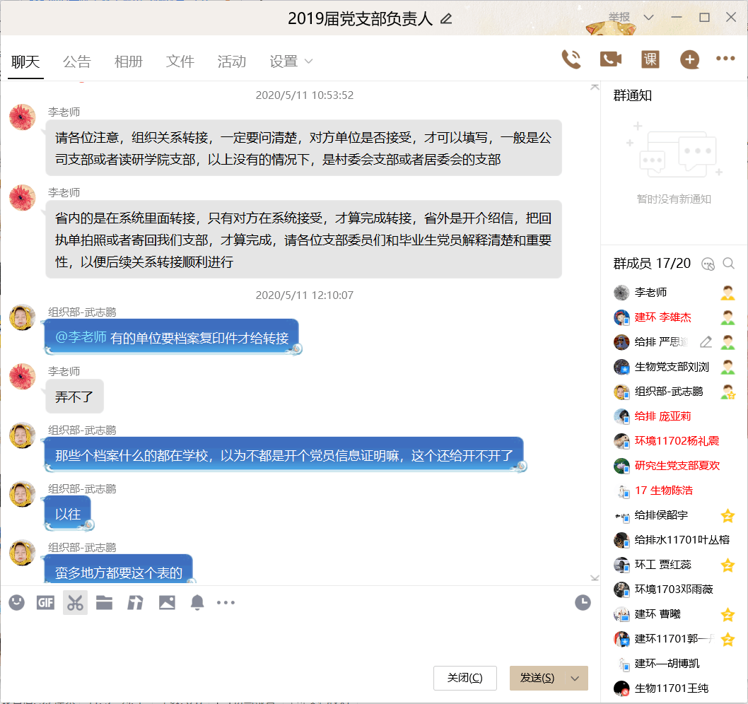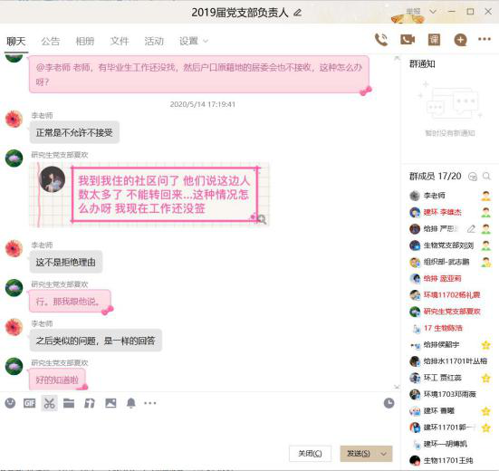 校组织部发放《关于切实做好2020届毕业生党员教育及组织关系转移等工作的通知》之初,李文倩老师便组织学生支部委员们自主学习毕业生党员关系转接流程及相关要求,对组织转移流程的基础要点进行强调,并线上实时解答问题,力求各学生支部负责人明确转接流程,为毕业生组织关系转移工作打好基础。